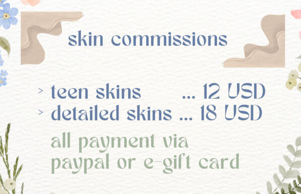 EXPECTATIONS :› I am okay with NSFW, furry, and gore skins, but please warn me before sending those reference images!› please be ready to give me a detailed description of what you would like for your skin(s), as well as an image reference› I will make as many adjustments as needed while working on the skin(s), but no changes will be made after it is finished and the file is sent over› I have full ownership of images of your commission to use in my portfolio + post on social media, even if you choose for me not to post the file (further down)
